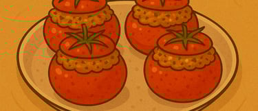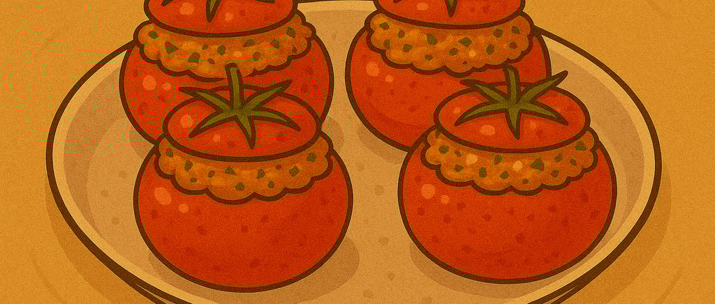 Now fill tomatoes, place the saved top of the tomato back on there and press down a little, place the stuffed tomatoes in a casserole dish and pour the tomato sauce around, cover the dish with aluminum foil, place in oven for 45 minutes at 180°C (about 350°F).